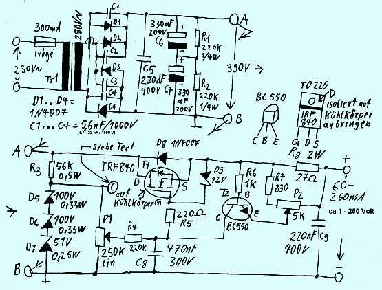 Ein Zufallsfund aus dem Netz zeigt nebenstehendes Bild. Die Strombegrenzung ist regelbar, der Gatewiderstand ist vorhanden, was will man mehr? Ich vermisse allerdings einen Elko parallel zu den Z-Dioden. R3 mit einem Wert von 56k erscheint mir etwas hoch. Dafür kann man die Kondensatoren C1-C4 parallel zu den Gleichrichterdioden getrost weglassen. Die Elkos C6, 7 kann man durch einen Elko von 100µF/450 V ersetzen. R1 und R2 entfallen dann natürlich. Leider auch hier wieder das Poti P1 auf 251 Volt. Also dass das noch niemanden aufgefallen ist........
